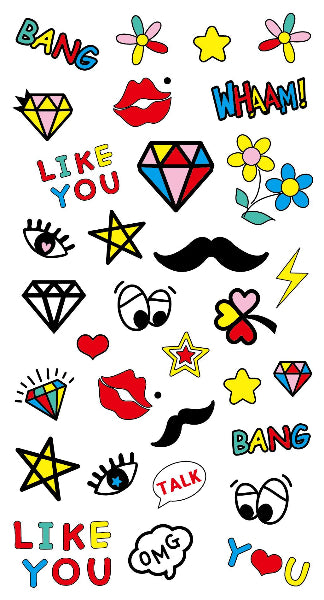 ab CHF 27.50Die farbenfrohen Tattoos im Pop-Art-Stil von Shine B sorgen für einen verspielten und trendigen Look. Ob Diamanten, Sterne, Lippen oder Comic-Schriftzüge – die Designs setzen auffällige Highlights und passen zu jedem Festival, Sommeroutfit oder besonderen Anlass. Einfach ohne Wasser aufkleben, den Tag geniessen und bei Bedarf rückstandslos entfernen. Ideal für alle, die gerne spontan und stylisch unterwegs sind.