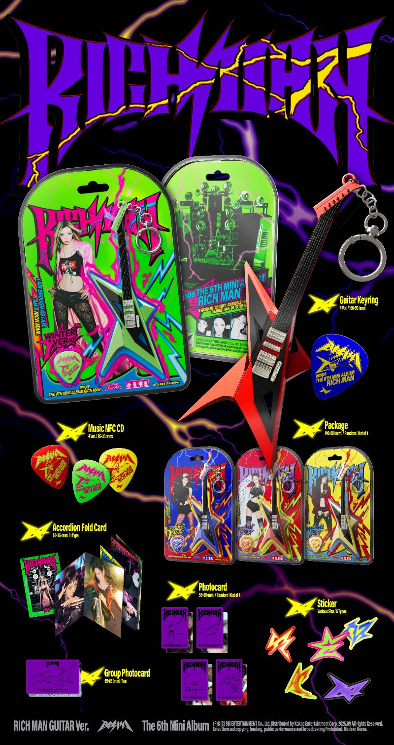 Das 6th Mini Album Rich Man (RICH MAN GUITAR Ver.) (Smart Album) ist eine spezielle Edition des sechsten Mini-Albums der südkoreanischen Girlgroup AESPA, das am 5. September 2025 veröffentlicht wurde. Diese Version setzt auf ein gitarreninspiriertes Konzept und kombiniert Musik mit sammelbaren physischen Elementen in kompakter Form. Das Album enthält ein versionsabhängiges Cover, einen Schlüsselanhänger sowie eine Music NFC CD. Ergänzt wird das Set durch eine Folding Card, fünf Sticker, eine zufällige Photocard sowie eine zusätzliche Group Photocard.