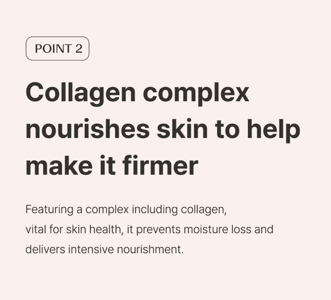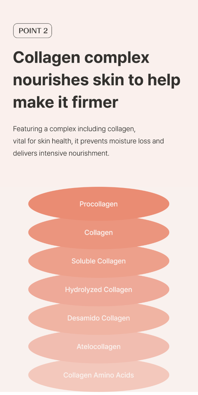Water, Glycerin, Caprylic/Capric Triglyceride, Butylene Glycol, Cetearyl Alcohol, 1,2-Hexanediol, Dimethicone, Glyceryl Stearate, Palmitic Acid, PEG-100 Stearate, Stearic Acid, Arginine, Carbomer, Polysorbate 60, Microcrystalline Wax, Hydrolyzed Adansonia Digitata Extract, Hydrolyzed Collagen, Disodium EDTA, Xanthan Gum, Hydrogenated Coconut Oil, Propanediol, Hydrolyzed Elastin, Benzyl Glycol, Atelocollagen, Desamido Collagen, Hydrolyzed Glycosaminoglycans, Sodium Hyaluronate, Portulaca Oleracea Extract, Soluble Collagen, Sodium Hyaluronate Crosspolymer, BHT, Collagen, Collagen Amino Acids, Hydrolyzed Hyaluronic Acid, Hydroxypropyltrimonium Hyaluronate, Procollagen, Hyaluronic Acid, Sodium Acetylated Hyaluronate, Ethylhexylglycerin, Fragrance