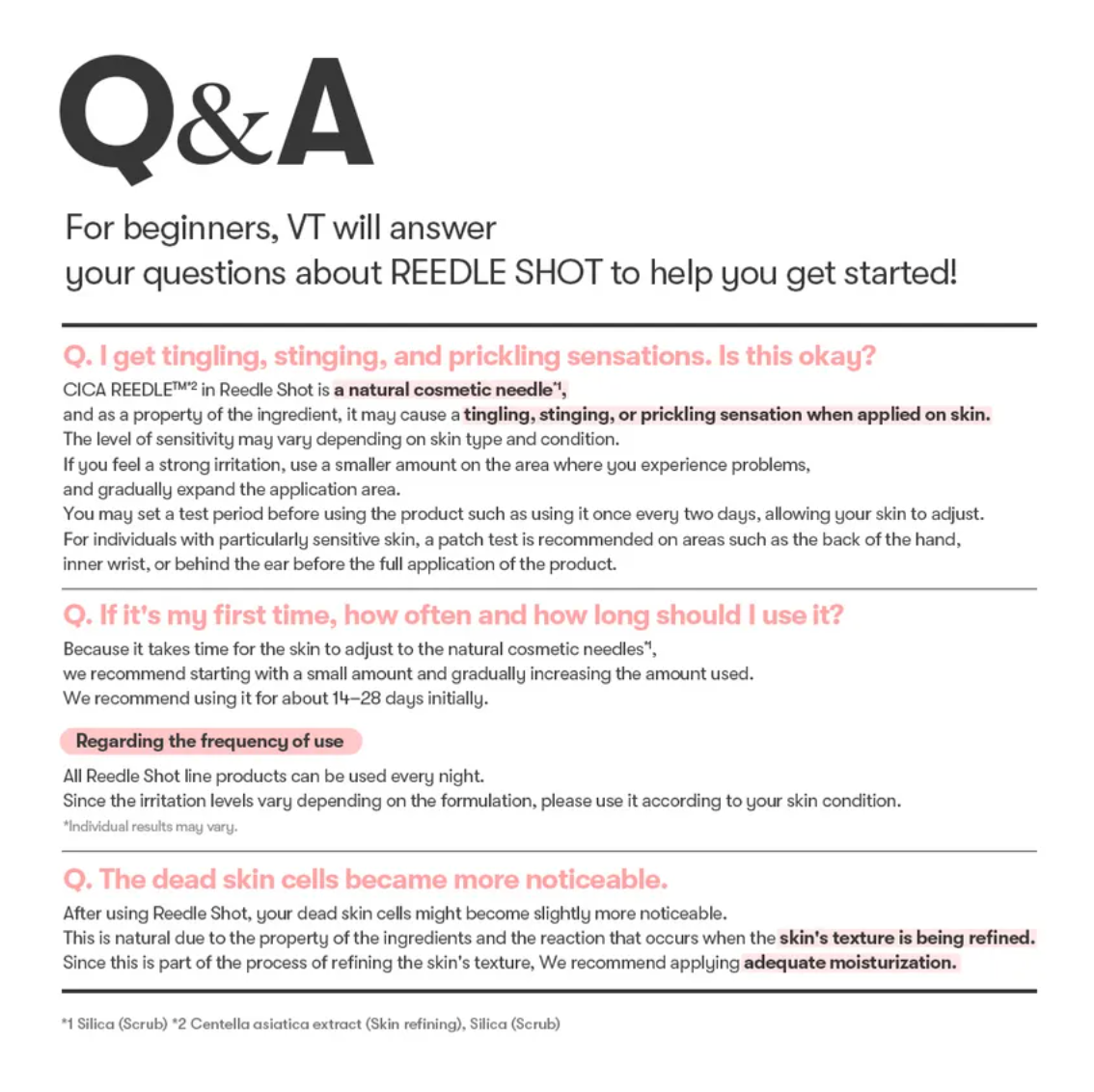 - Auch wenn die Haut nach der Anwendung schuppiger wirkt, ist dies ein erwarteter Peeling-Effekt. Entfernen Sie abgestorbene Hautzellen nicht manuell, sondern setzen Sie REEDLE SHOT regelmässig ein. Eine ausreichende Feuchtigkeitspflege wird empfohlen.
