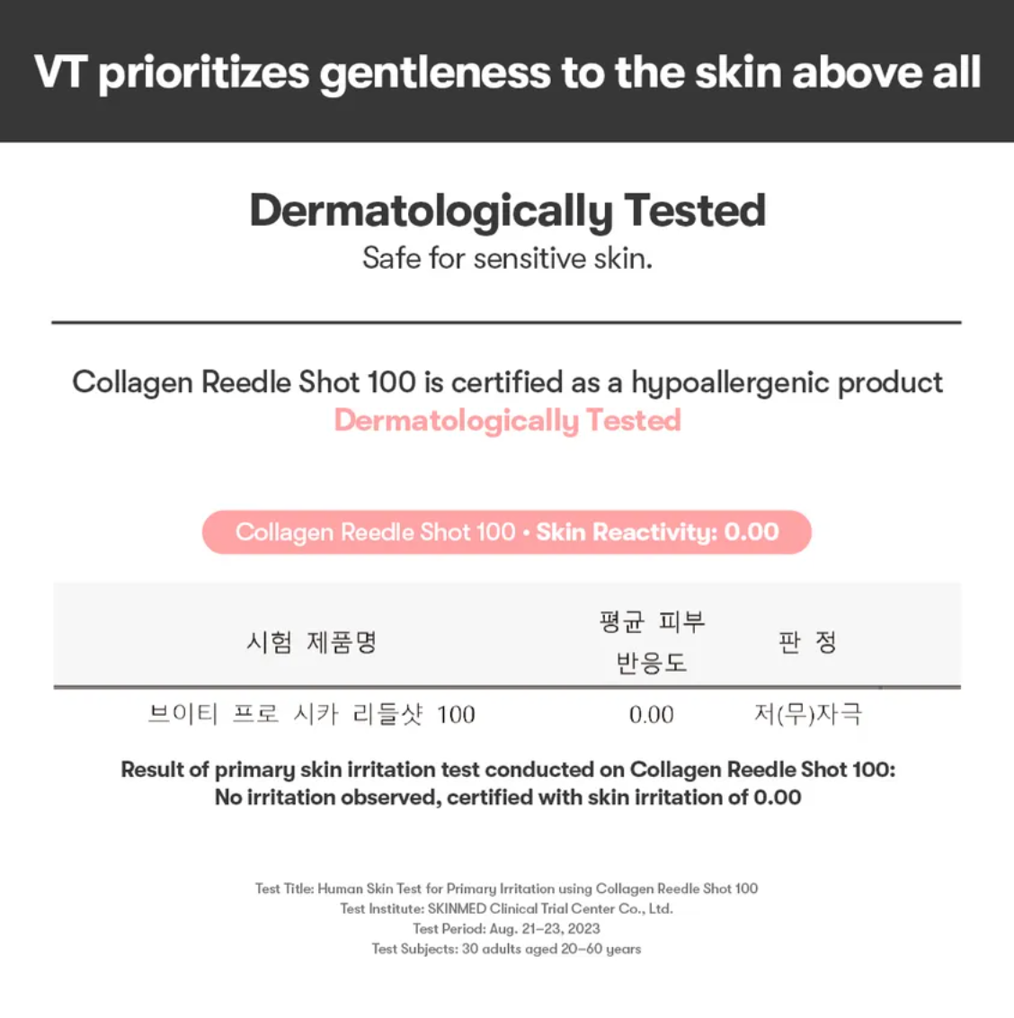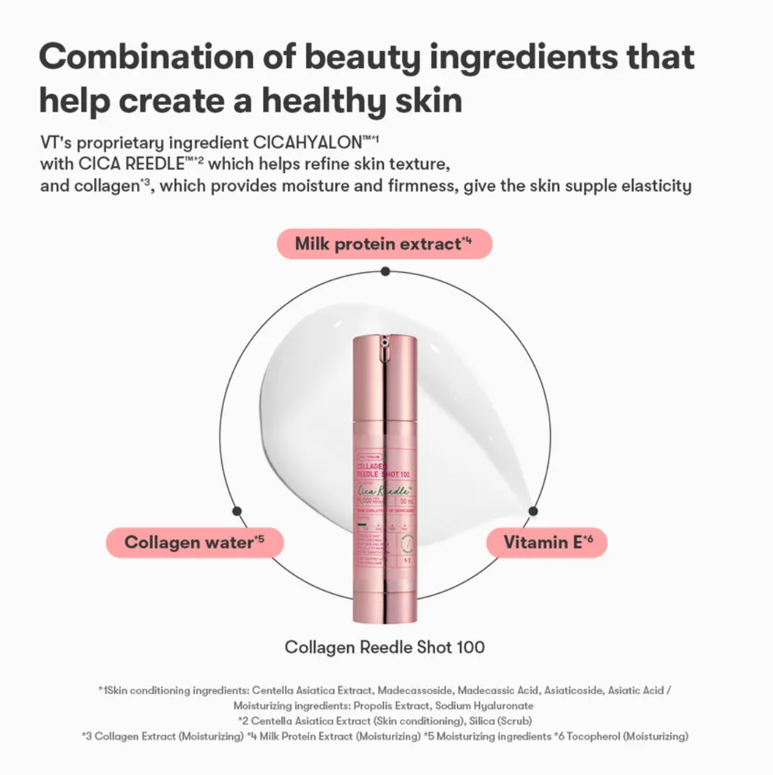 Der Collagen Reedle Shot 100 von VT ist ein hochwirksamer Pflege-Booster für mehr Festigkeit und Elastizität. Mit Kollagen, Milchprotein-Extrakt, Vitamin E und feuchtigkeitsspendendem Collagen Water wird die Haut intensiv mit Nährstoffen versorgt und spürbar aufgepolstert. Die innovative Cica Reedle™ Technologie mit mikrofeinen Mineralpartikeln unterstützt die Aufnahme der Wirkstoffe tief in die Hautschichten und verfeinert die Hautstruktur. Ideal für trockene, empfindliche oder erschlaffte Haut, die neue Spannkraft und Feuchtigkeit benötigt. Dermatologisch getestet und auch für sensible Haut geeignet.