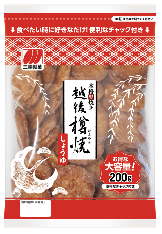 Echigo Taruyaki Shoyu von Sanko sind gebackene Reiskekse mit einer Sojasaucen-Würzung. Durch die schonende Reifung erhält die Sojasauce ein besonders tiefes Aroma, das perfekt mit der knusprigen Textur der Reiskekse harmoniert. Die 200g-Packung eignet sich perfekt zum Teilen oder für den Genuss zu Tee und anderen Getränken.