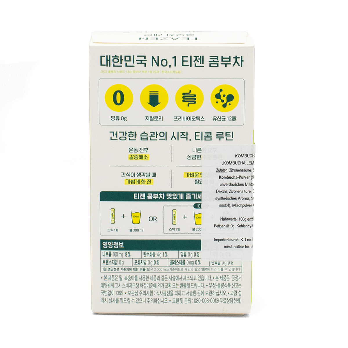 Zutaten: Zitronensäure, Erythrit, Natriumbicarbonat, organisches Kombucha-Pulver (Bio-Kombucha-Tee, Bio-Maltodextrin), unverdauliches Maltodextrin, Zitronensaftpulver (Zitronensaft, Dextrin, Zitronensäure, Gummi arabicum), Fructooligosaccharid, synthetisches Aroma, Schwarztee-Extrakt-Pulver, Sucralose (Süssstoff), Mischpulver aus 12 Arten von Milchsäurebakterien, Kartoffelstärke