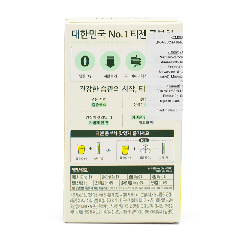 Zutaten: Zitronensäure, Ballaststoffliste, Natriumbicarbonat, Kombucha-Pulver, Erythritol, Ananassaftpulver (Dextrin,Ananassaftfeststoffe), Fructooligosaccharid, Aromatisierung, Schwarzteeextraktpulver, Vitamin B2, Sucralose (Süssstoff), Milchsäurebakterien 12 Arten gemischtes Pulver, Kartoffelstärke