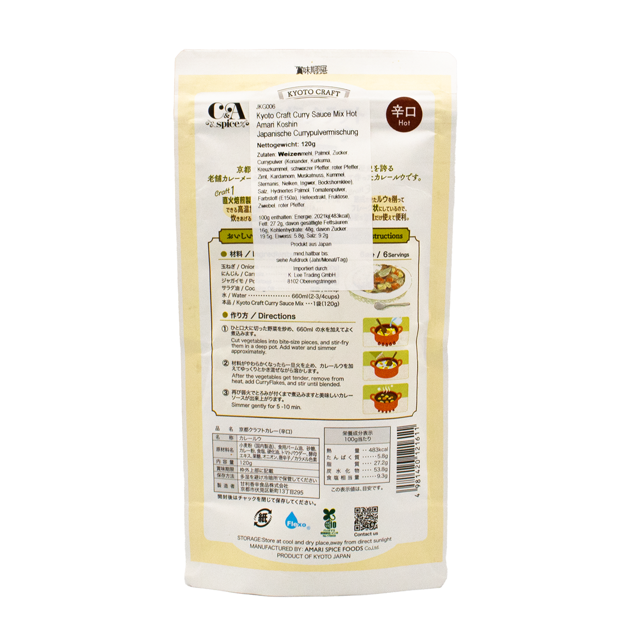 Die Kyoto Craft Curry Sauce Mix Hot von Amari Koshin ist eine intensiv-würzige japanische Currybasis, die ein vollmundiges Aroma mit deutlich spürbarer Schärfe bietet. Der Mix wird in Wasser oder Brühe angerührt und ergibt eine kräftige Sauce, die besonders gut zu Reis, Fleisch oder Gemüse passt. Mit ihrer Kombination aus aromatischer Tiefe, dezenter Süsse und feuriger Schärfe verleiht sie japanischen Currygerichten einen authentischen Geschmack. Die Packung eignet sich für sechs Portionen.