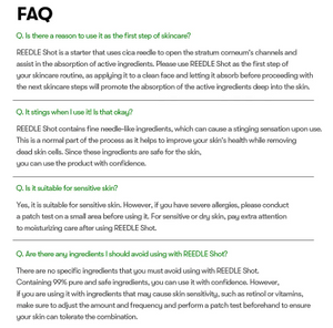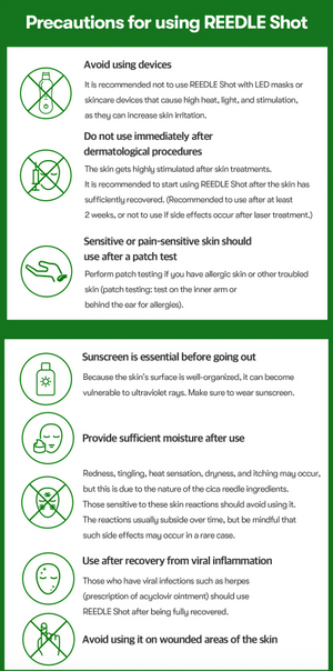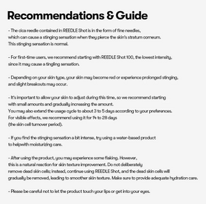 Tragen Sie bei Anwendung am Tag zusätzlich Sonnenschutz auf und kombinieren Sie Reedle Shot nicht gleichzeitig mit anderen Stärken (100/300/700/1000).