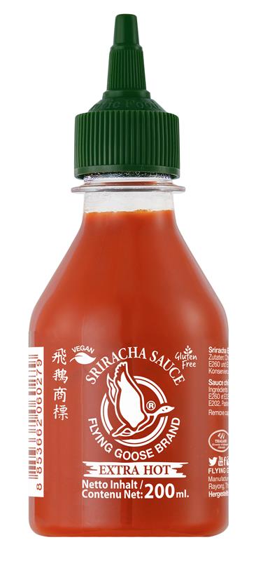 Die scharfe Chilisauce Sriracha von Flying Goose ist eine aromatische Chilisauce, die Schärfe und Knoblauch mit einer leichten Süsse kombiniert. Hergestellt aus roten Chilischoten, verleiht diese Sauce Gerichten eine feurige Würze. Sie ist vielseitig einsetzbar und eignet sich ideal als Dip, zum Verfeinern von Wok-Gerichten, für Suppen, Sandwiches oder als Ergänzung für Sushi und Burger.