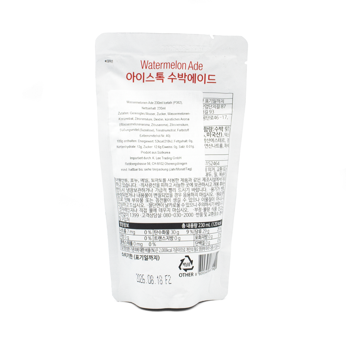 Zutaten: Gereinigtes Wasser, Zucker, Wassermelonen-Konzentrat, Zitronensäure, Dextrin, künstliches Aroma (Wassermelonenaroma, Zitrusaroma), Zitronensäure, Süssungsmittel (Sucralose), Trinatriumcitrat, Farbstoff (Lebensmittelrot Nr. 40)
