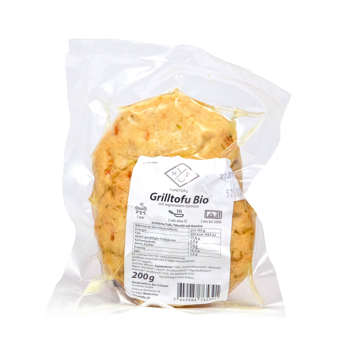 ab CHF 27.50Der Bio Grill Tofu von Yumetofu kommt in zwei handlichen Stücken und ist bereits vorgegart. Hergestellt aus biologischen Sojabohnen, überzeugt dieser Tofu durch seine feste Textur und ein mild-nussiges Aroma. Ob auf dem Grill, in der Pfanne oder als Einlage in Bowls und Salaten – dieser Tofu nimmt Aromen hervorragend auf und eignet sich ideal für herzhafte Marinaden oder schnelle Gerichte.