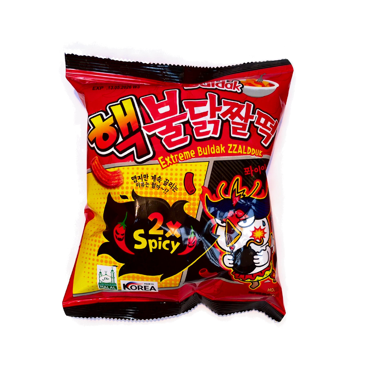 Die Zzal Dduck Snack 2x Spicy ist ein besonders scharfer, knuspriger Snack mit dem charakteristischen „Buldak“-Feuerhuhn-Geschmack. Hergestellt aus Weizenmehl und verfeinert mit Gochujang, Habanero und Paprikaextrakt, verbindet er süsslich-würzige Noten mit intensiver Chili-Schärfe. Der Snack ist kross, aromatisch und ideal für alle, die kräftig gewürzte koreanische Snacks mit deutlicher Schärfe schätzen.